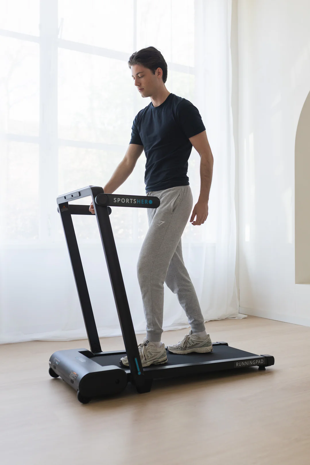 Le RUNNINGPAD est super facile à ranger ! 💪 Grâce à la main courante pliable, vous pouvez facilement le ranger sous votre canapé ou contre le mur. Pas de tracas, pas de perte d’espace – il suffit d’entrer et de ranger ! 🚶♂️✨
